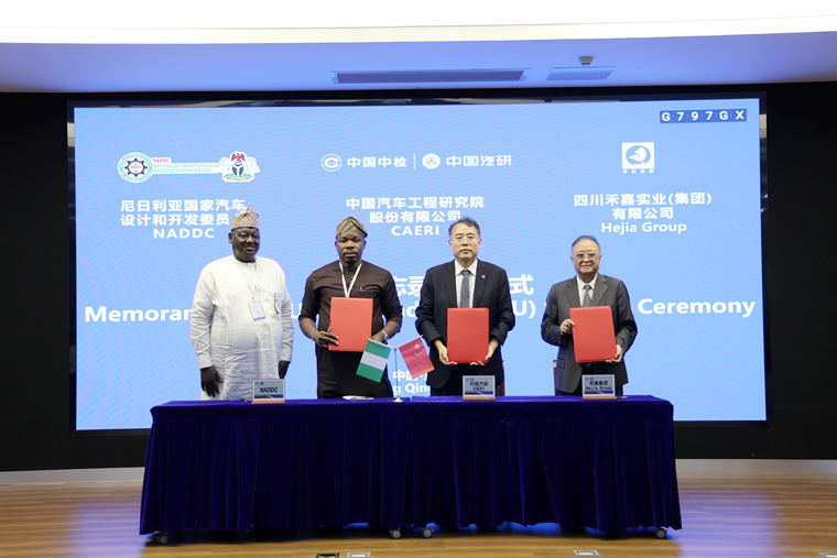 28日下午,在中汽研会议厅,中国汽研党委书记、董事长周玉林,尼日利亚NADDC总干事奥萨尼宾,政策规划与统计司主任穆萨,bw必威西汉姆联官网集团董事局主席夏朝嘉共同签署了三方合作备忘录。