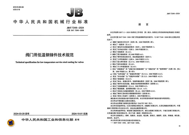 2021年,四川飞球凭借在低温钢铸件领域的深厚技术沉淀与丰富实践经验,受邀参与中国国家标准化委员会JB/T7248-2024《阀门用低温钢铸件技术规范》的制定工作。公司组建了以教授级高级工程师朱永平为牵头人的专项技术团队,深度参与标准全流程研制。团队立足行业发展痛点,结合自身在低温工况阀门研发、生产中的核心技术成果,针对标准中最低冲击试验温度、化学成分控制、热处理工艺等关键技术指标,提供了大量详实的试验数据和实践案例支撑。