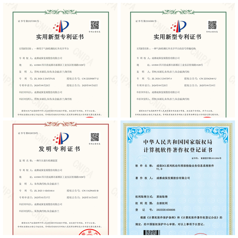 今年以来,公司在知识产权创造和保护方面取得显著成效。在专利方面,“一种汽车刹车检测装置”获得发明专利授权,该专利针对传统刹车检测中存在的精度不足,通过优化结构设计,提升了刹车性能检测的精度与效率,为汽车制动检测设备的技术升级提供重要支撑。“一种气体检测红外光学平台的信号传输结构”和“一种用于气体检测的红外光学平台”两项实用新型专利的授权,则体现了公司在气体检测核心技术上的突破。这些专利通过优化光学平台的结构设计和信号传输路径,显著提升了检测设备的稳定性和可靠性,为汽车排放检测等领域提供了更精准的技术支撑。在软件方面,公司新申请了两项软件著作权,其中“DCG系列机动车排放检验业务信息系统软件v1.0”已取得计算机软件著作权证书,整合检验预约、数据采集、报告生成等全流程功能,实现排放检验数字化、规范化管理,为检验机构与行业监管提供高效解决方案。这些知识产权成果的落地,不仅体现了公司持续精进的研发实力与创新能力,更通过法律手段保护了核心技术成果,为公司产品的市场推广与技术迭代提供了坚实保障,进一步巩固了公司在汽车检测设备行业的技术优势。