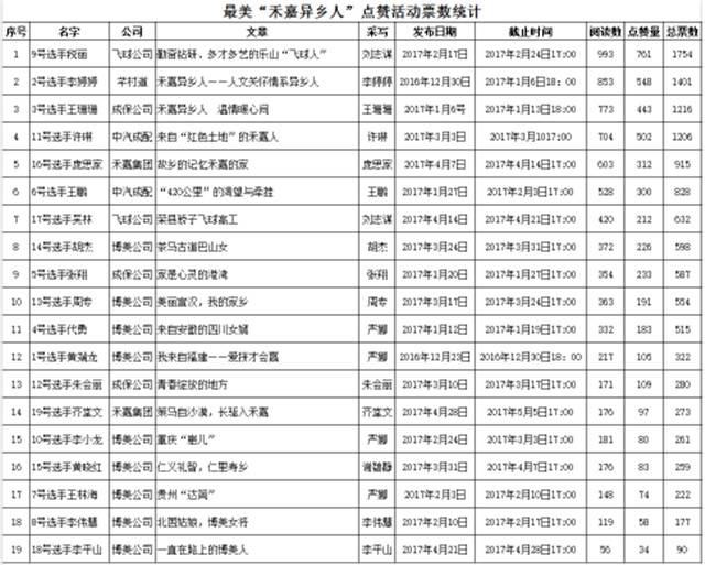 活动设置四个奖项,分别是最佳可爱奖、最佳人气奖、最佳认同奖、最佳融入奖。根据微信每篇“bw必威西汉姆联官网异乡人”阅读数和点赞数的总票数决出名次并评选出获奖结果如下:最佳可爱奖二名,为:9号选手税丽、2号选手李婷婷,奖金各600元;最佳人气奖三名,为:3号选手王珊珊、11号选手许琳、16号选手庞思家,奖金各400元;最佳认同奖六名,为:6号选手王鹏、17号选手吴林、14号选手胡杰、5号选手张翔、13号选手周专、4号选手代勇,奖金各300元;最佳融入奖八名,为:1号选手黄端龙、12号选手朱会丽、19号选手齐堂文、10号选手李小龙、15号选手黄晓红、7号选手王林海、8号选手李伟慧、18号选手李平山,奖金各200元。参加活动的19位“bw必威西汉姆联官网人”的得票总数见下表。