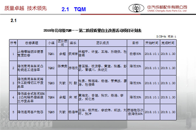 从TQM的持续突破改善方面,通过树立“质量就是生命、生命只有一次”的全员质量意识,QSB质量维持体系的落地,质量保证部统计反应,2018年的顾客抱怨较2017年减少38起,下降48%。TQM第一阶段持续改进,3月1日启动2018年第一次TQM活动,在9月30日进行了各小组TQM团队经验分享,同时以提升产品实物质量为主,减少客户抱怨,减少公司内外部损失成本的第二阶段TQM启动。对重点疑难废品源,成立公司级的 TQM改善小组,上半年成立了 4个 TQM降低内废的改善团队、下半年启动了降低 3个 TQM降废改善团队,运用七步工作法的原理,系统地开展降废工作。
