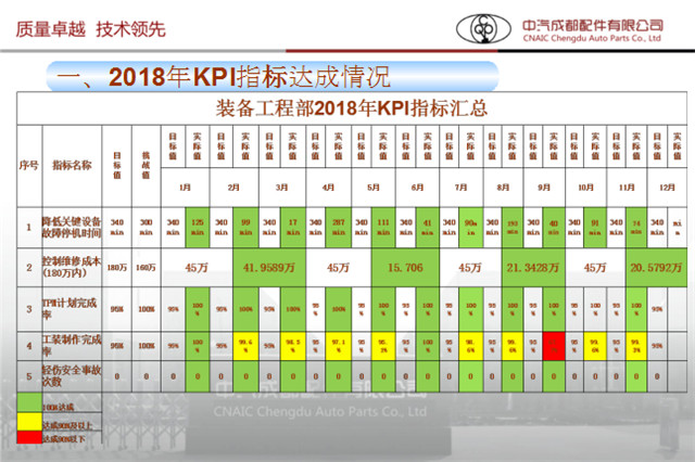 从设备管理方面,装备工程部2018年全年关键设备平均故障停机时间较2016年/2017年有一定改善(385min--158min--117min),其中4月份故障停机时间最 长,主要原因为商用车凸轮轴车间好克斯加工中心维修难度大且时间长造成,电器维修整体时间正常;12月份随着设备使用年限超5~10年及以上的设备,电器故障率明显上升且有着不确定性,如何有效解决将成为2019年的重要课题,同时高价值长周期备件的判断购买以及老系统的维修成为难题。KPI指标完成整体效果很好,但是工装计划完成率存在问题,9月份目标未达成,主要原因是临时性计划太多。