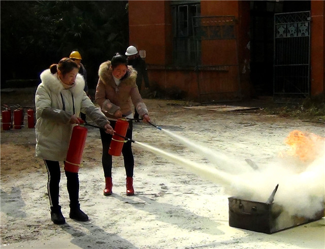 三、常用灭火器材;ABC干粉灭火器,二氧化碳灭火器。使用方法;先拔掉保险销、右手握住压把、左手将软管对准火焰根部,左右扫射2—3米距离,人逆风而站。安技员王典贵还亲自演示了用干粉灭火器和水带扑灭火灾的使用方法。