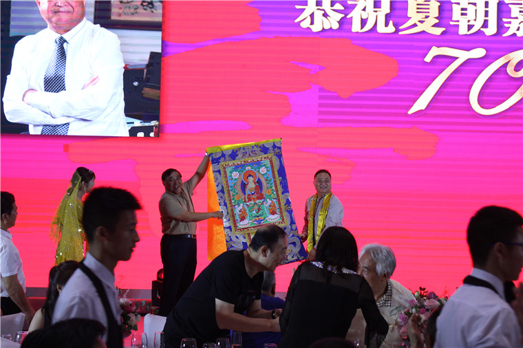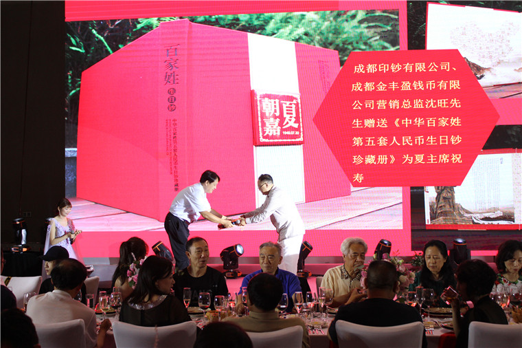 成都印钞有限公司,成都金丰赢钱币有限公司营销总监沈旺先生为夏主席祝寿并现场赠送中华百家姓第五套人民币生日钞珍藏册。bw必威西汉姆联官网集团老朋友张东升先生为夏主席祝寿,并现场赠送知名艺人手工制作具有西藏民族特色唐卡一幅和哈达一条,同时安东汽车发动机制造有限公司、天圆公司董事长刘天聚、北京天圆全会计师事务所、北京天圆全工程造价咨询有限公司、北京天圆开资产评估有限公司、通威集团董事局主席刘汉元发来贺信为夏主席祝寿 。陶氏宗亲送来《中国最 大观云平台牛背山观日照金山》画一幅、成都金顶精密铸造有限公司送来屏风蜀绣《玉兰花开》一幅,巴蜀笑星李伯清、国际著名雕塑家蔡志松、仁恒置地集团执行董事、仁恒置地集团(深圳)董事长钟思亮先生及夫人卓丽娃女士、明星陈冰、银达集团董事长及夫人(明星陈冰父母)、歌唱演员周旋、温馨发来祝福视频共同为夏主席祝寿。